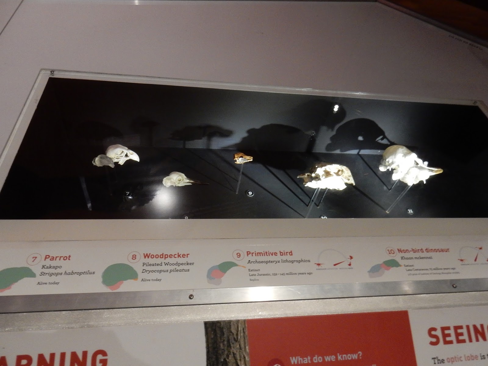 An entire wall showing the stepwise acquisition of "avian" traits and the nebulousness of the term "bird". Unfortunately, some workers were repairing the interactive "test how well each dinosaur can fly" game, so I could neither get a better picture of the wall nor observe how the game worked.