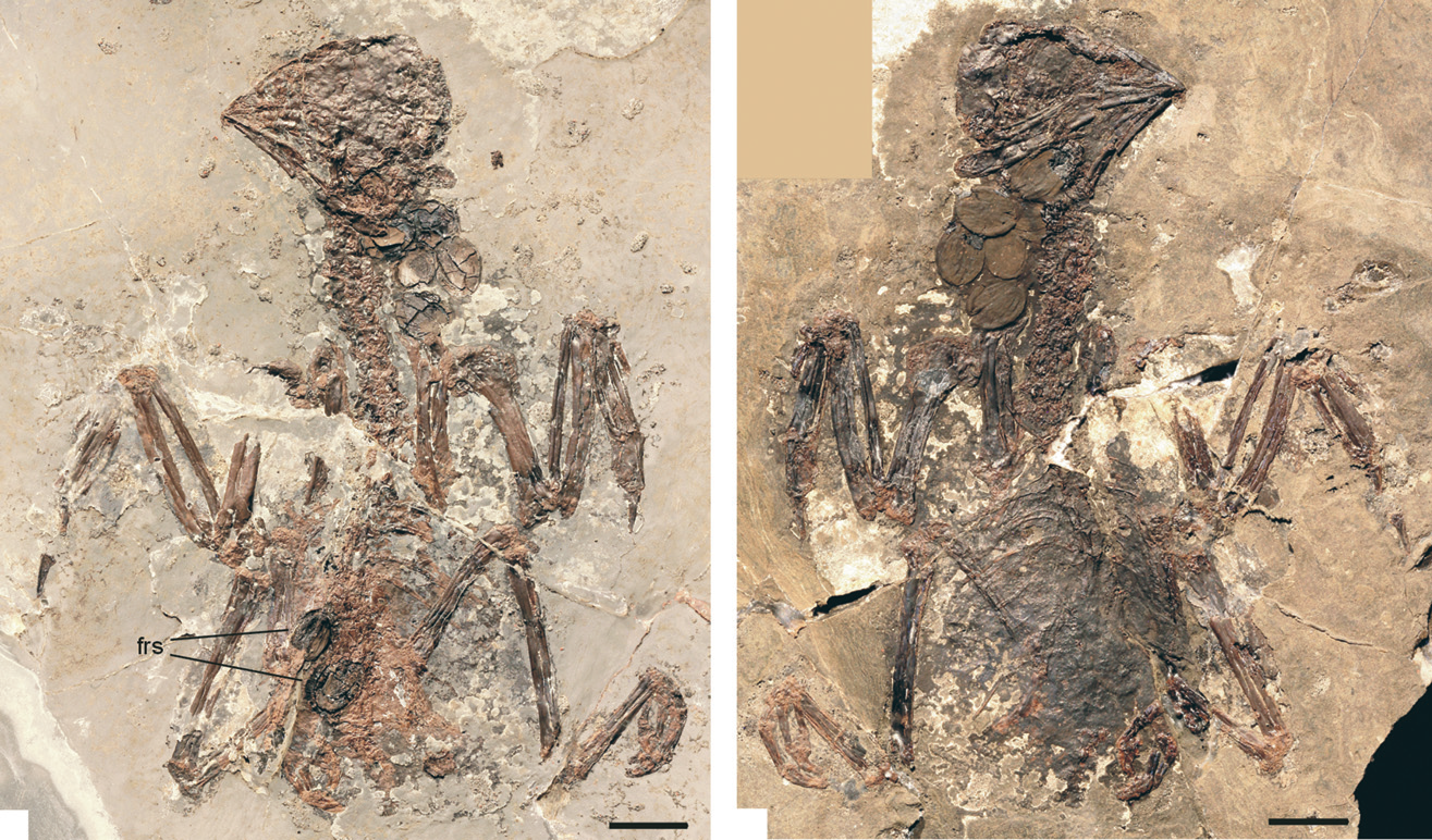 Holotype of Oligocolius psittacocephalon, from Mayr (2013). Note the large seeds preserved in the throat region.